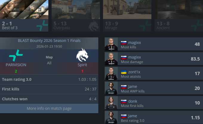 Команда PVISION пробилася до півфіналу BLAST Bounty Season 1 Finals, здобувши перемогу над Spirit з рахунком 2:1. Для Spirit це стала перша поразка відтоді, як Борис «magixx» Воробйов узяв на себе роль IGL.