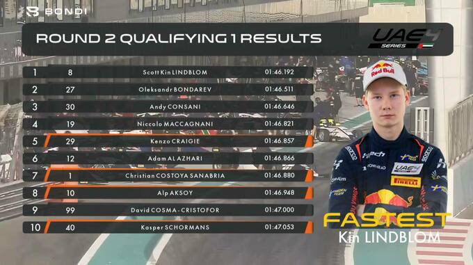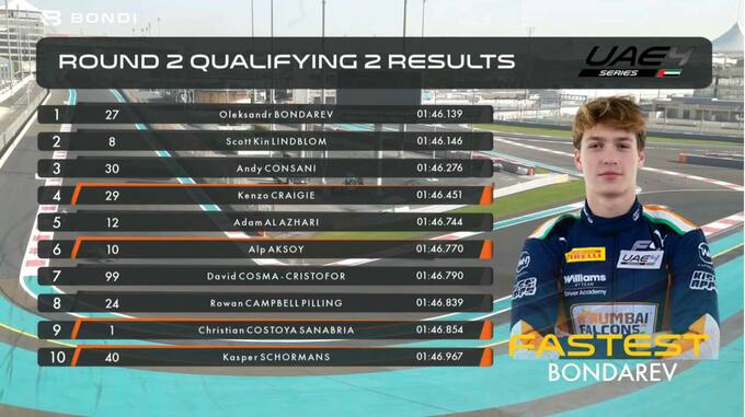 Перед стартом першої гонки Олександр Бондарев очолює загальний залік Формули-4 Близького Сходу, маючи 51 заліковий бал.