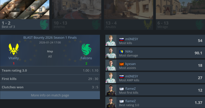 Команда Falcons пробилася до гранд-фіналу BLAST Bounty 2026 Season 1, обігравши Vitality з рахунком 2:1. Навіть попри провал на Anubis (4:13), колектив зумів переломити хід серії та здобути путівку до фіналу.