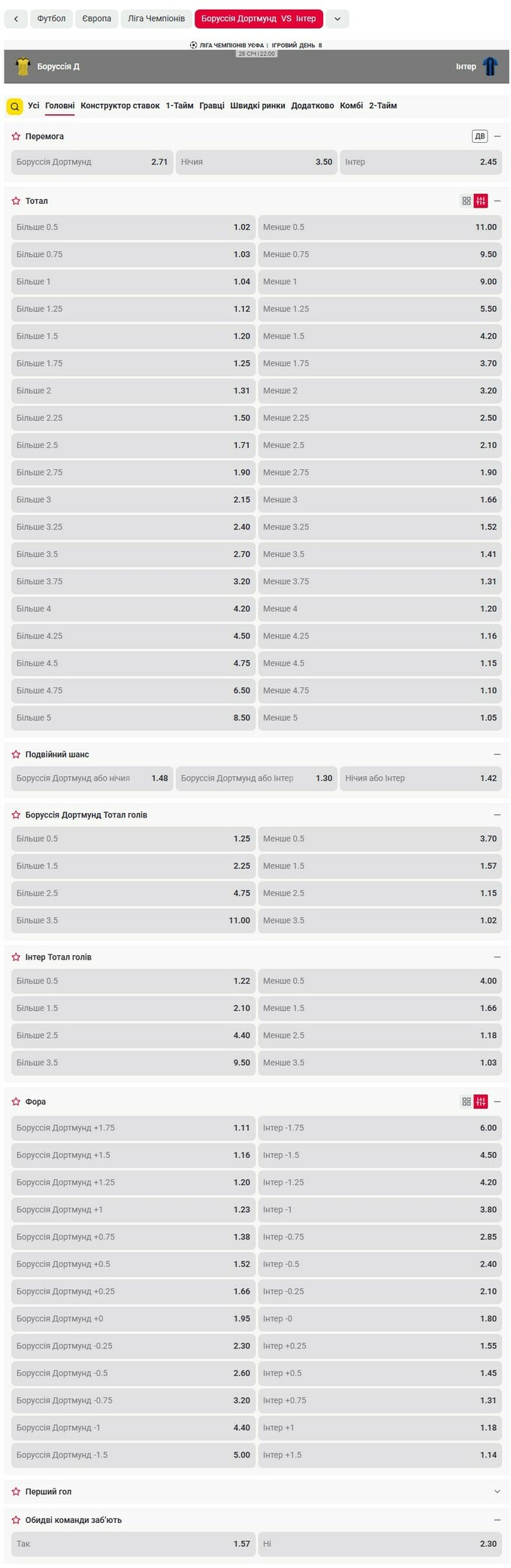Лінія та коефіцієнти на матч Боруссія Д – Інтер