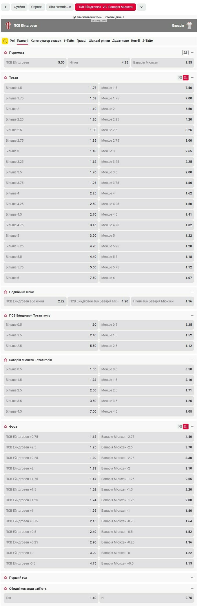 Лінія та коефіцієнти на матч ПСВ – Баварія