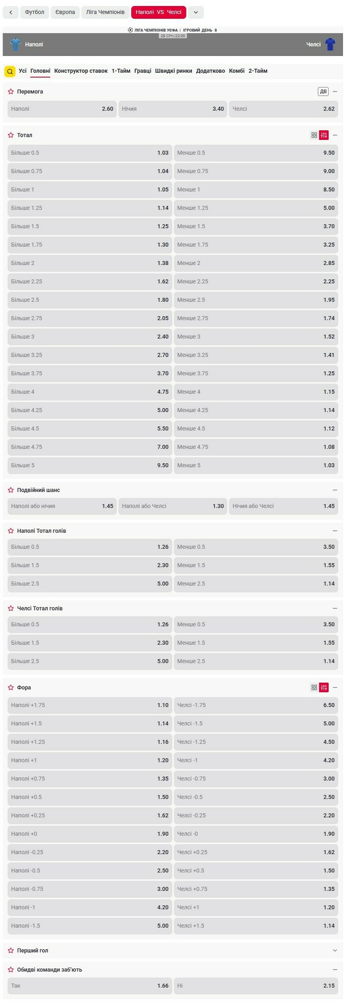 Лінія та коефіцієнти на матч Наполі – Челсі