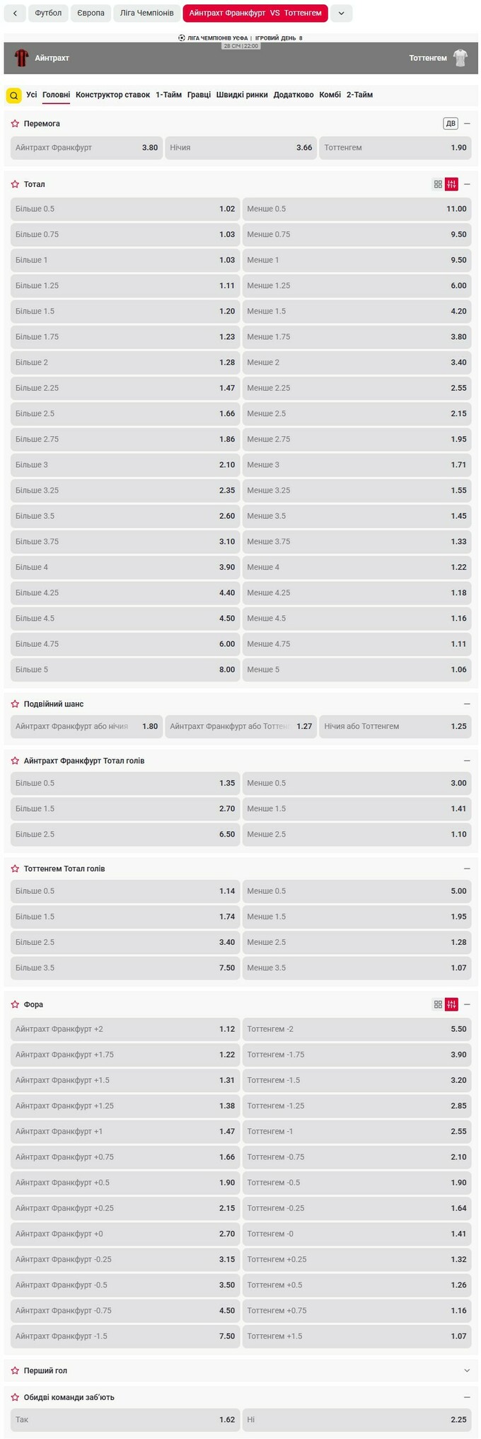 Лінія та коефіцієнти на матч Айнтрахт – Тоттенхем
