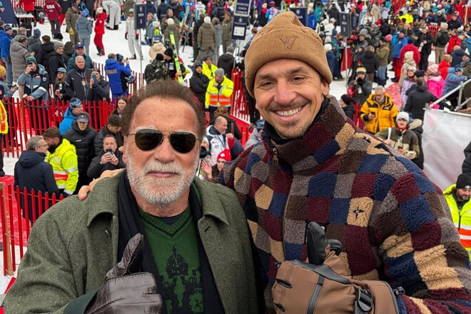 На фото Златан позує разом із Арнольд Шварценеггер на масштабному зимовому заході на тлі багатотисячного натовпу.