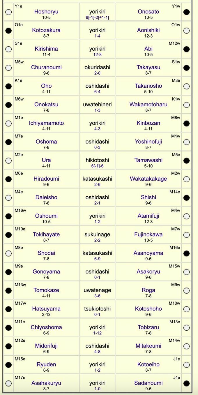 Інший українець, маеґашіра №14 Шіші Масару (Сергій Сколовський) після приголомшливого старту (8 перемог в 10-ти сутичках) на фініші трохи здав, програвши чотири поєдинки з п’яти. З одного боку, це не дивно, адже Шіші в кінцівці боровся з рікіші з верхньої частини рейтингу. З іншої – якщо Сергій хоче претендувати на щось серйозне, цих суперників треба навчитися перемагати. Скажімо, маеґашіру №4 Гаято Даєйшо, якому Соколовський програв сьогодні.