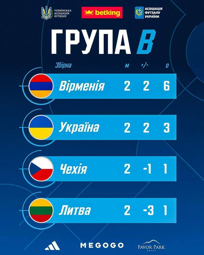 Турнірне становище у групі B: Вірменія – 6 очок, Україна – 3 очки, Чехія, Литва – по 1 очку.