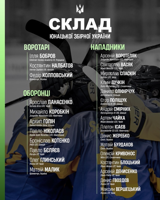 Нападники: Арсеній Воротеляк (Jungadler Mannheim U20, Німеччина), Святослав Васяк (Mladá Boleslav U20, Чехія), Мирослав Спаскін (Litvínov U20, Чехія), Клим Лучкін (Michalovce U20, Словаччина), Данило Оліфірчук (GKS Katowice, Польща),Єгор Поліщук (Olofströms IK U18, Швеція), Андрій Смірних (Flemingsbergs IK U18, Швеція), Артем Чайка (Mladá Boleslav U20, Чехія), Платон Ісаєв (Düsseldorfer EG U20, Німеччина), Денис Жеребко (Сокіл, Україна), Матвій Бурдаков (Сокіл, Україна), Олексій Кривонос (Nitra U20, Словаччина), Костянтин Блоцький (Pilsen Wolves U17, Чехія), Арсеній Денисенко (Slavia Praha U17, Чехія), Денис Гвоздєв (Prerov U17, Чехія),Максим Вершецький (Poruba U17, Чехія)