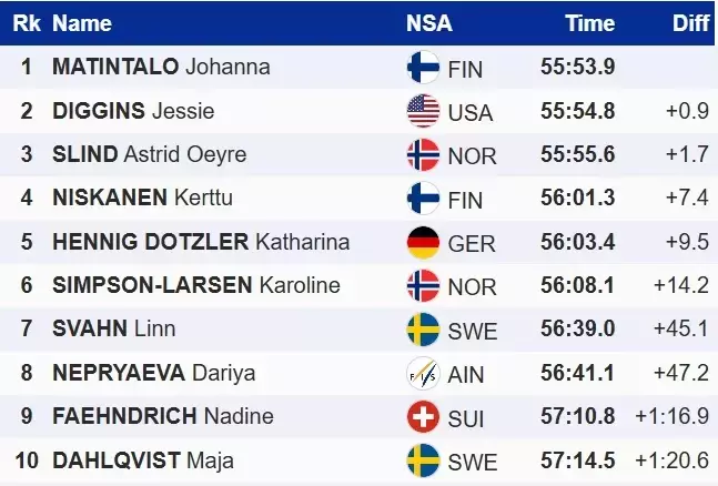 Лідерка загального заліку, Джессіка Діггінс, залишилася позаду. Американка програла 0.9 секунди та показала другий результат.