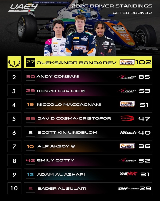 У сезоні UAE4 2026 бере участь українець Олександр Бондарев, який після двох етапів очолює загальний залік чемпіонату, маючи перевагу в 17 очок над найближчим переслідувачем. Для Бондарева участь у серії на Близькому Сході є важливою частиною підготовки до європейської частини сезону, як і у 2025.