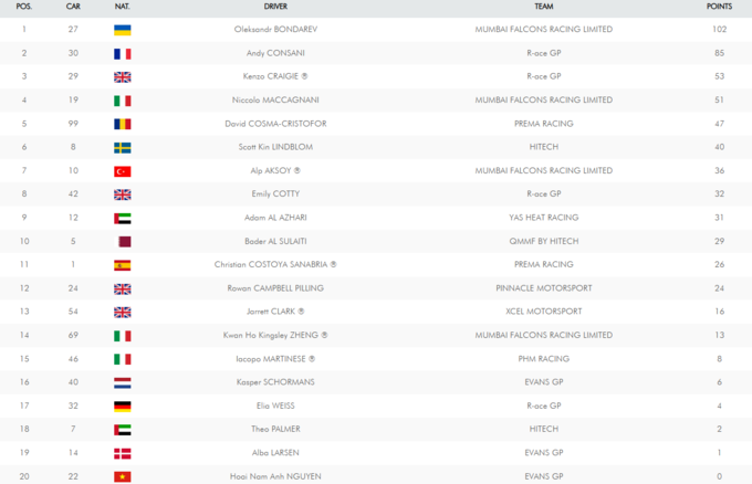 За підсумками етапу Олександр Бондарев очолює загальний залік чемпіонату з 102 очками, випереджаючи Енді Косані на 17 балів. Інші суперники значно відстають і можуть нав’язати боротьбу за титул у двох фінальних вікендах сезону радше математично.
