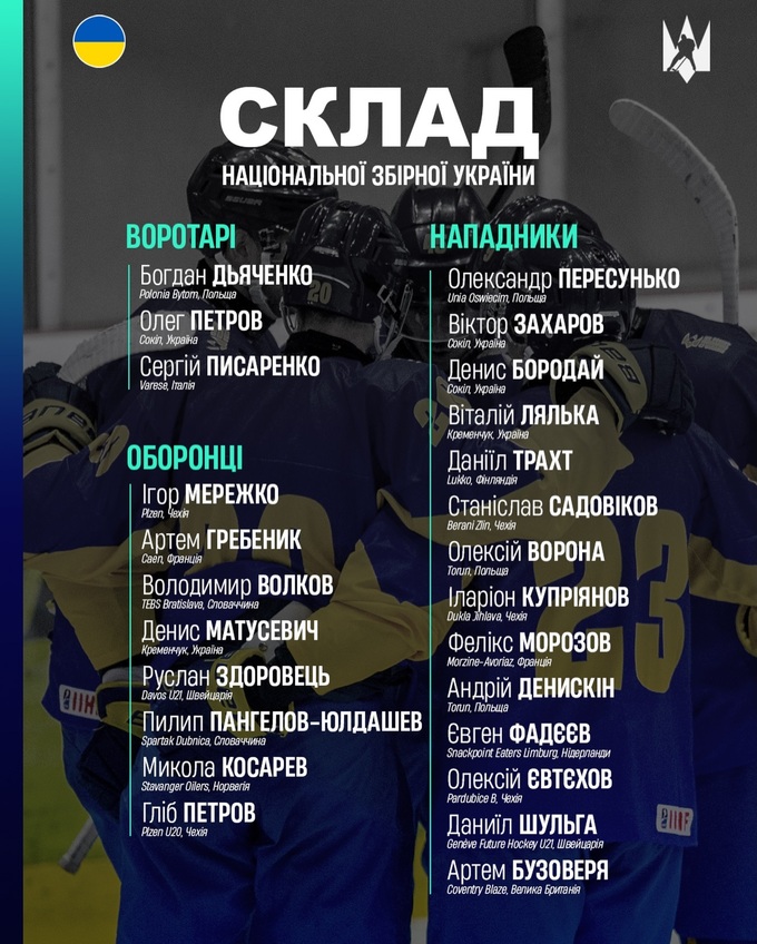 Нападники: Олександр Пересунько (Unia, Польща), Віктор Захаров (Сокіл, Україна), Денис Бородай (Сокіл, Україна), Віталій Лялька (Кременчук, Україна), Данііл Трахт (Lukko, Фінляндія), Станіслав Садовіков (Berani Zlin, Чехія), Олексій Ворона (Torun, Польща), Іларіон Купріянов (Dukla Jihlava, Чехія), Фелікс Морозов (Morzine-Avoriaz, Франція), Євген Фадєєв (Snackpoint Eaters Limburg, Нідерланди), Андрій Денискін (Torun, Польща), Олексій Євтєхов (Pardubice B, Чехія), Даниїл Шульга (Genève Future Hockey U21, Швейцарія), Артем Бузоверя (Coventry Blaze, Велика Британія).
