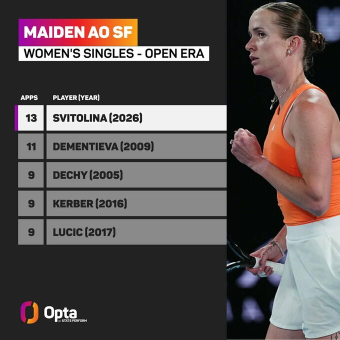 Світоліна – тенісистка з найбільшою кількістю виступів в основній сітці (13), необхідних, щоб вперше в кар'єрі вийти до півфіналу жіночого одиночного розряду Australian Open у Відкритій ері.