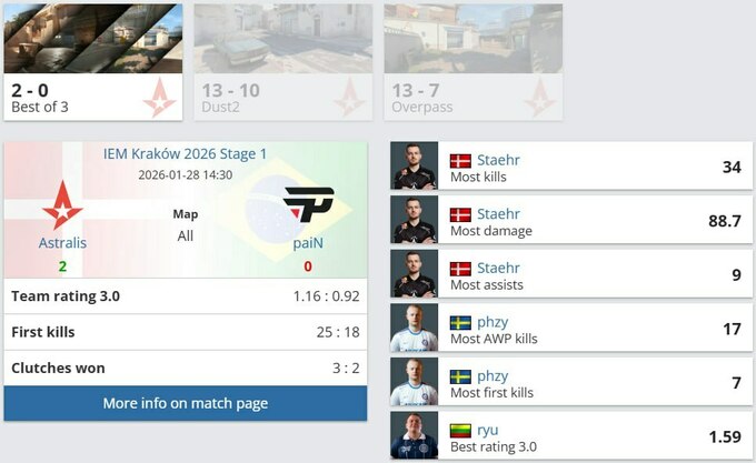 Astralis розпочали виступ на IEM Krakow з упевненої перемоги над paiN – 2:0 у матчі першої стадії. Новачок команди Гітіс «ryu» Глушаускас провів вражаючий LAN-дебют, ставши найкращим гравцем серії з рейтингом 1.59.