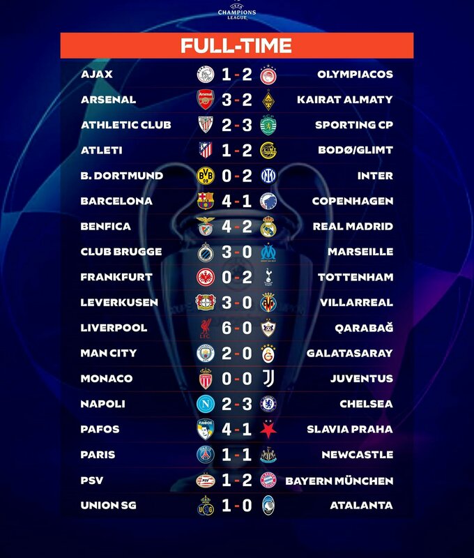Португальська Бенфіка під керівництвом Жозе Моуріньо, з вирішальним голом українського голкіпера Анатолія Трубіна на 90+8 хвилині, обіграла мадридський Реал (4:2), і з 9 очками вскочила в плей-оф з 24-го місця.
