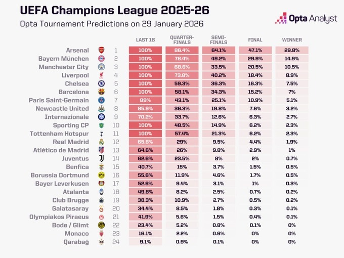 Аналітичний портал Opta оновив шанси команд в боротьбі за престижний трофей – головним фаворитом вважається лондонський «Арсенал» (29,8%), який посів підсумкове перше місце в основному етапі.