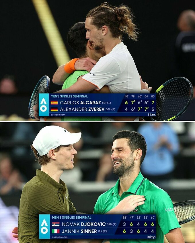Лідер світового рейтингу Карлос Алькарас відіграв подачу на матч у Александра Звєрєва і здобув перемогу в п'яти сетах. Зустріч тривала 5 годин і 27 хвилин – найдовший в історії півфінал Australian Open і третій найдовший матч в історії турніру.