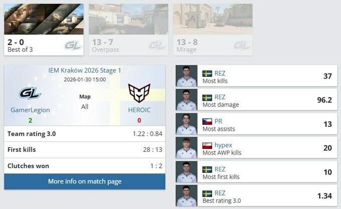 Головним героєм став Олдржих «PR» Новий. Після провальної серії напередодні чеський ріфлер повністю перезавантажився, оформив ейс на Overpass та завершив мапу з рейтингом 1.60. Атмосфера в GamerLegion була розкутою, а HEROIC так і не змогли нав’язати реальну боротьбу.