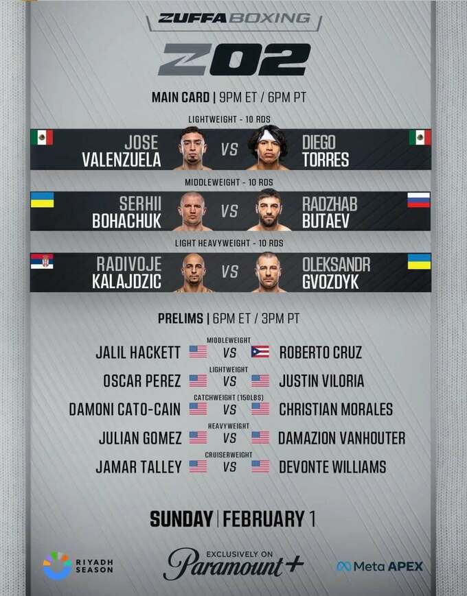 У ніч на 2 лютого на арені «Meta Apex» в американському Лас-Вегасі відбудеться масштабний вечір боксу Zuffa Boxing 02, організований за підтримки Дейни Уайта та Туркі Аль-Шейха.