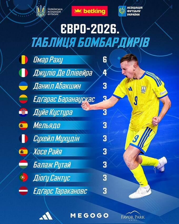 Абакшин входить до топ-10 бомбардирів чемпіонату Європи 2026 з футзалу