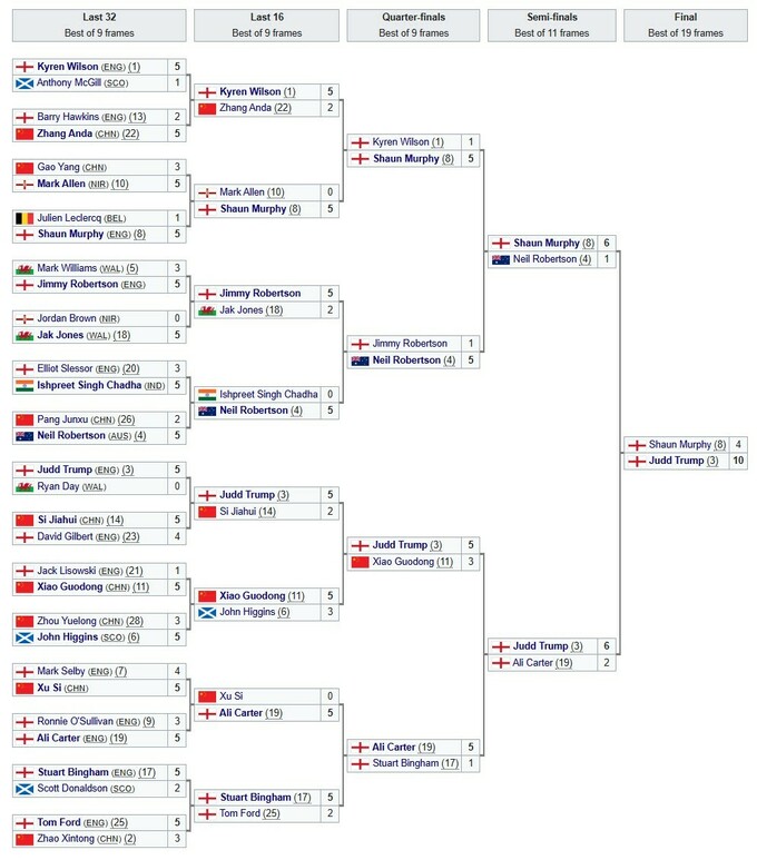 Днем раніше у півфіналах Трамп обіграв Алі Картера (6:2), а Мерфі розгромно переміг Ніла Робертсона з Австралії (6:1).