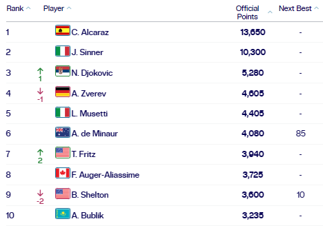 У найближчого переслідувача – Янніка Сіннера – 10 300 балів. Відрив становить 3 350 пунктів.