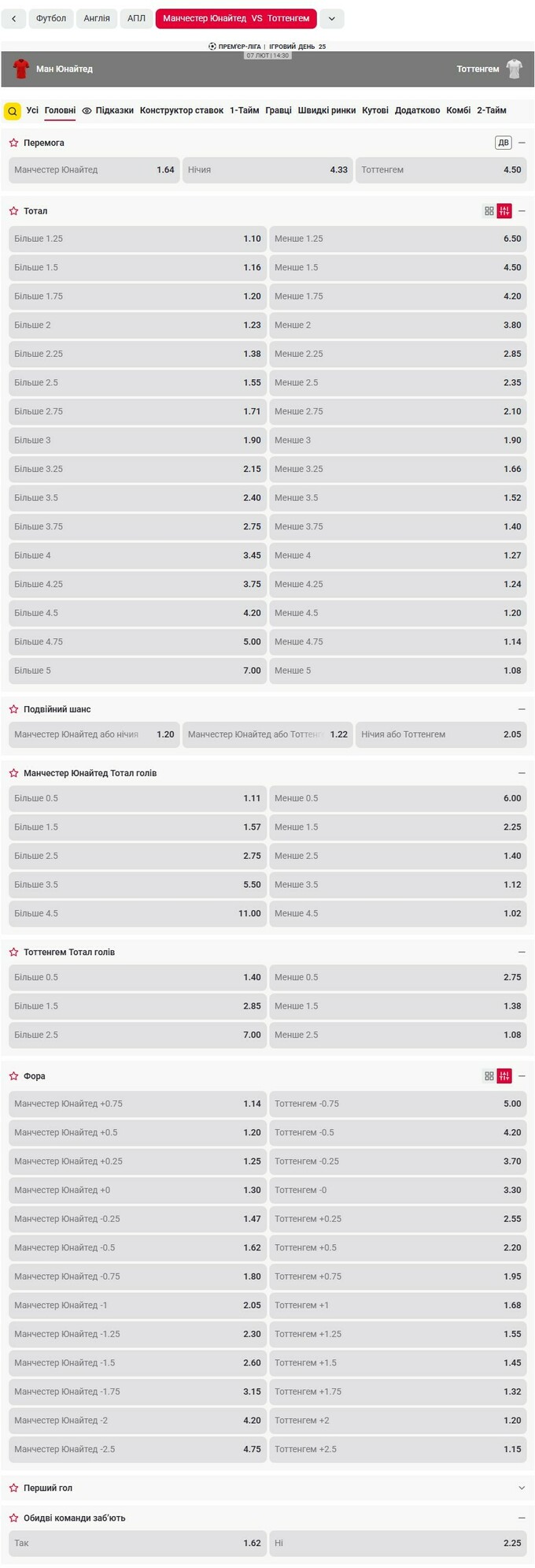 Лінія та коефіцієнти на матч Манчестер Юнайтед – Тоттенхем