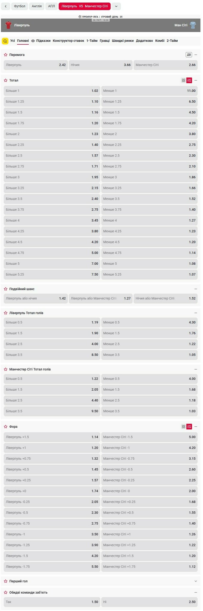 Лінія та коефіцієнти на матч Ліверпуль – Манчестер Сіті