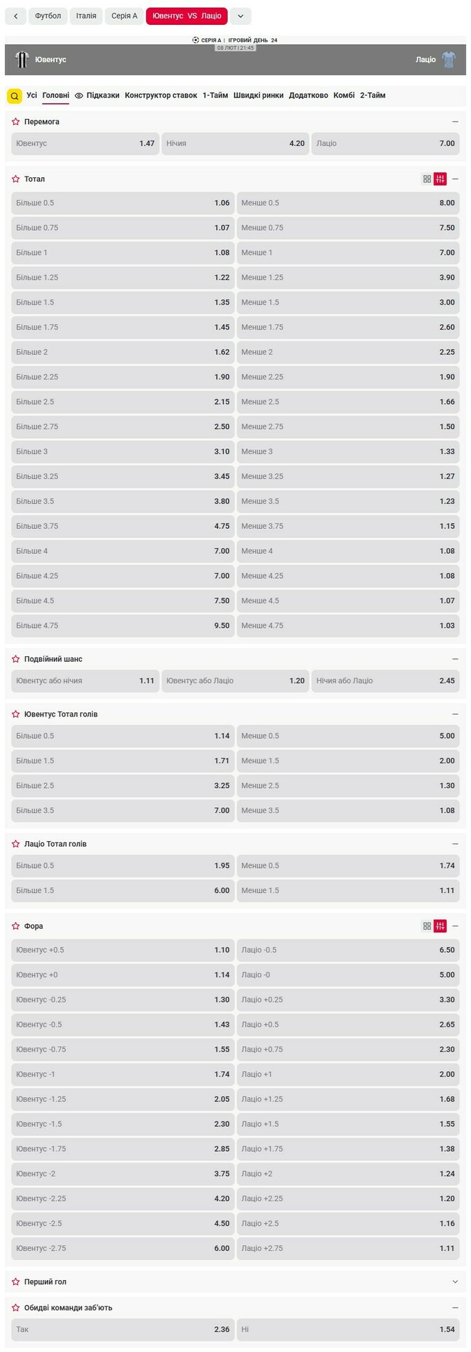 Лінія та коефіцієнти на матч Ювентус – Лаціо