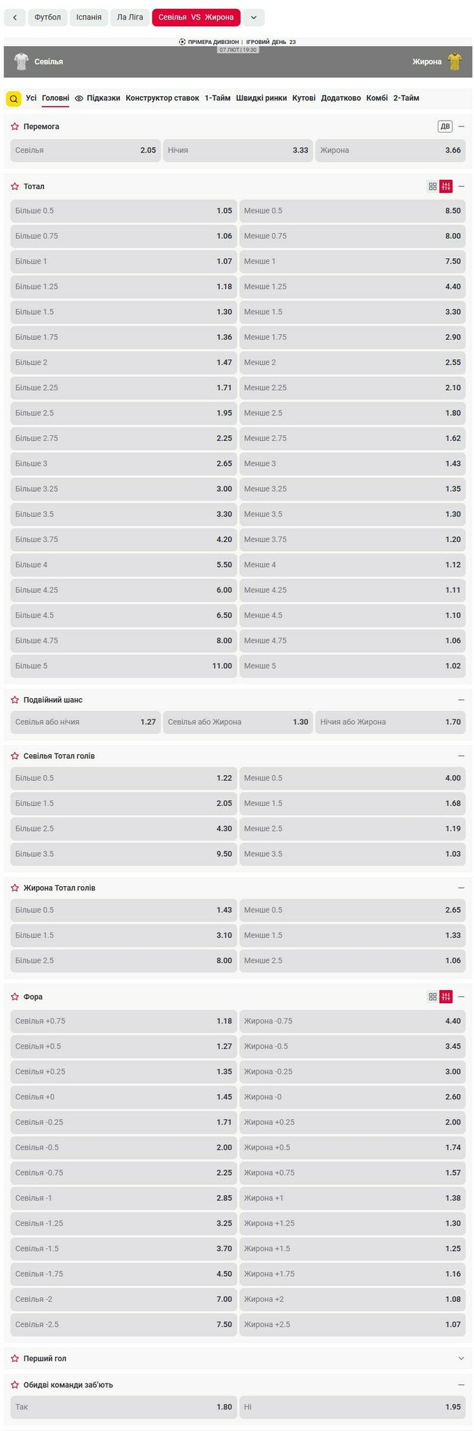 Лінія та коефіцієнти на матч Севілья – Жирона