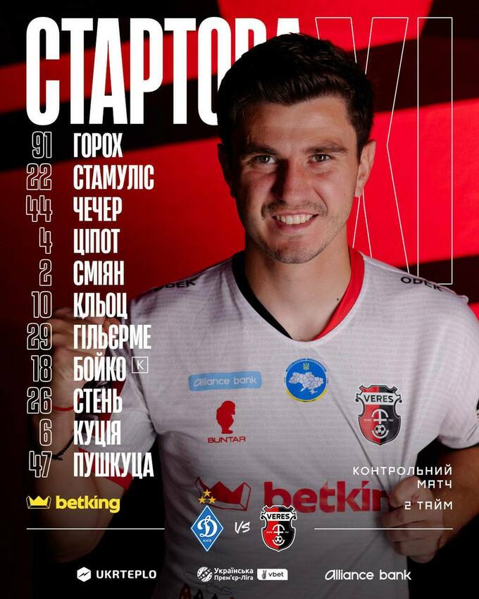 «Верес»: Кожухар – Корнійчук, Гончаренко, Вовченко, Протасевич – Харатін – Шарай, гнп, Годя, Гонсалвеш – Ндукве.