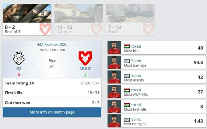 Команда MOUZ пробилася до півфіналу IEM Krakow 2026 з CS2, обігравши G2 Esports з рахунком 2:0 у напруженій чвертьфінальній серії. Колектив під керівництвом Неманьї «huNter-» Ковача поступився на Overpass (16:13) та Dust2 (13:7), попри велику кількість рівних і близьких за сценарієм раундів.
