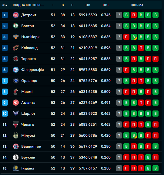 У матчі лідерів Східної конференції «Детройт» приймав «Нью-Йорк» та виграв усі чверті, розгромивши суперника з рахунком 118:80.