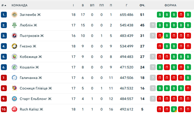Галичанка програла чотири матчі поспіль. У турнірній таблиці чемпіонату Польщі львівський клуб йде на сьомому місці.