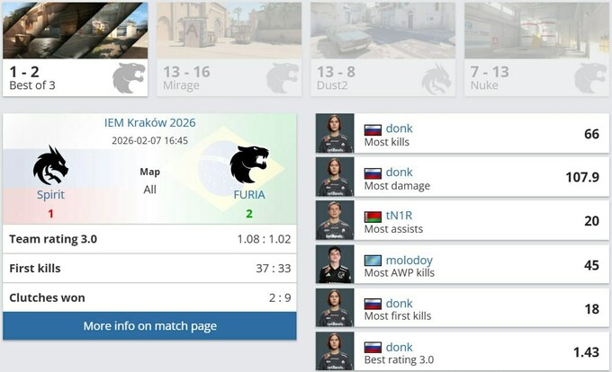 Вирішальною стала Nuke, де molodoy знову нагадав про свій клас. Казахський AWPer домінував із перших раундів, оформивши кілька мультикілів та клатчів. FURIA завершили першу половину з рахунком 9:3, а molodoy мав статистику 17–4. Попри спробу камбеку від Spirit, бразильці довели матч до впевненої перемоги.