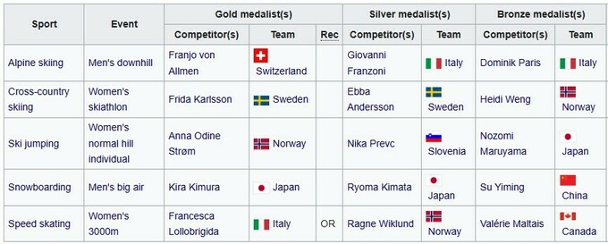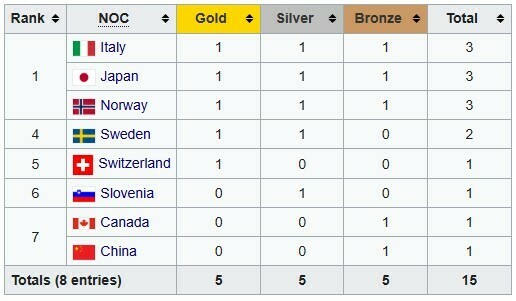 До топ-3 медальної таблиці входять: Італія, Японія та Норвегія, які вже зібрали повний комплект нагород (1–1–1).