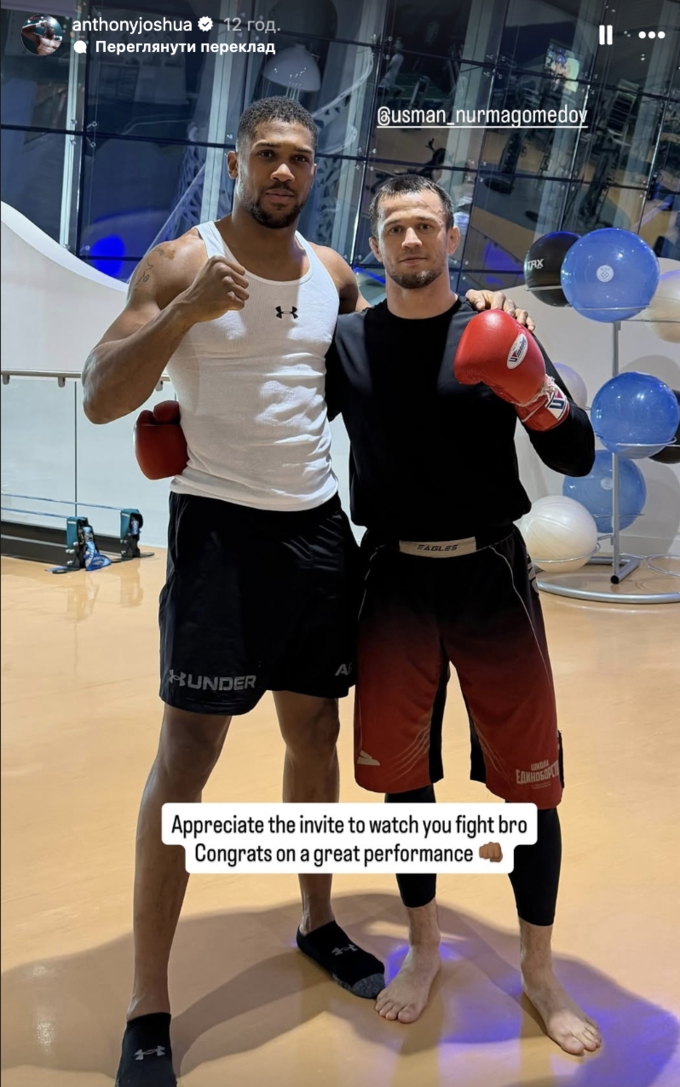 Перша поява Джошуа відбулася 7 лютого – він відвідав турнір PFL MMA в Дубаї, де головним боєм став поєдинок за участю Усмана Нурмагомедова. Британець відвідав роздягальню, де тепло привітався і обійнявся з Хабібом Нурмагомедовим, а також чемпіоном UFC Ісламом Махачевим. Пізніше боксер виклав і спільне фото з Усманом.