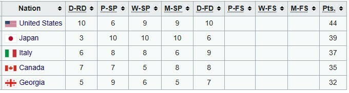 За підсумками змагального дня після коротких програм і ритм-танцю американці набрали 44 очки, випереджаючи найближчих суперників – Японію (39) та Італію (37).