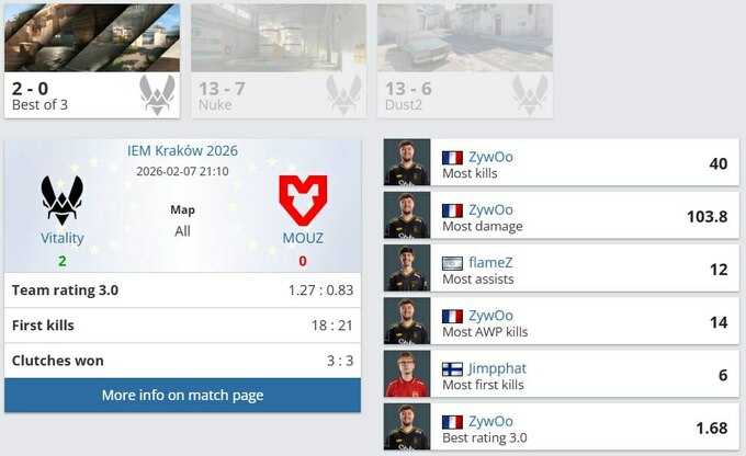 Vitality ж діяли максимально впевнено: на Nuke вони повністю контролювали гру за сторону захисту, а на Dust2 швидко захопили ініціативу й довели матч до логічної перемоги.