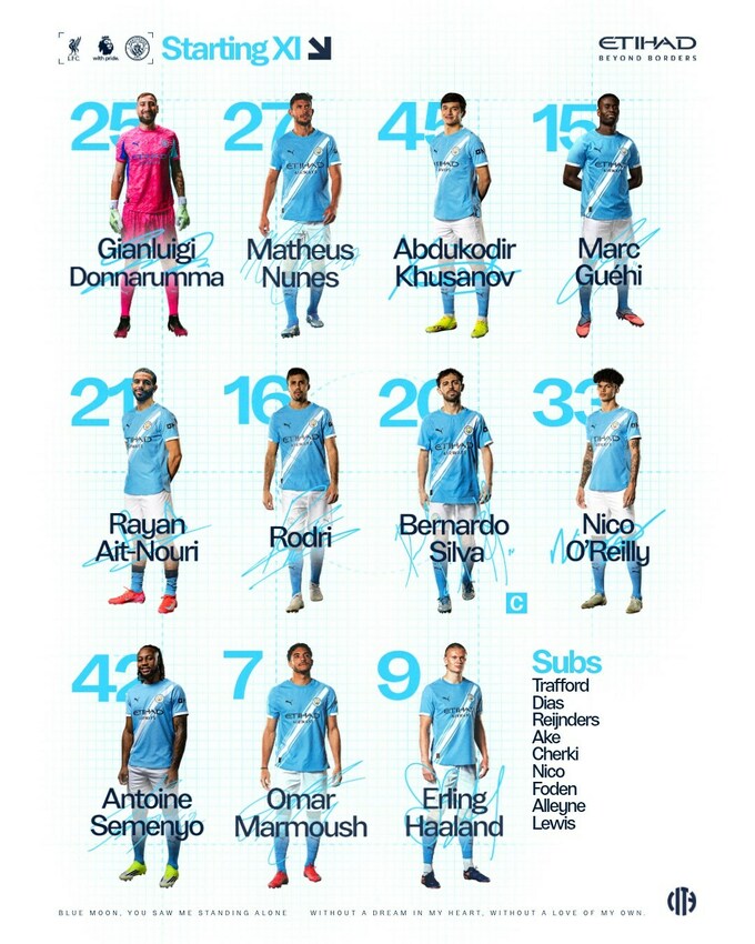«Манчестер Сіті»: Доннарумма – Аїт-Нурі, Геї, Хусанов, Нунес – О’Райлі, Родрі, Сілва – Мармуш, Голанд, Семеньйо.
