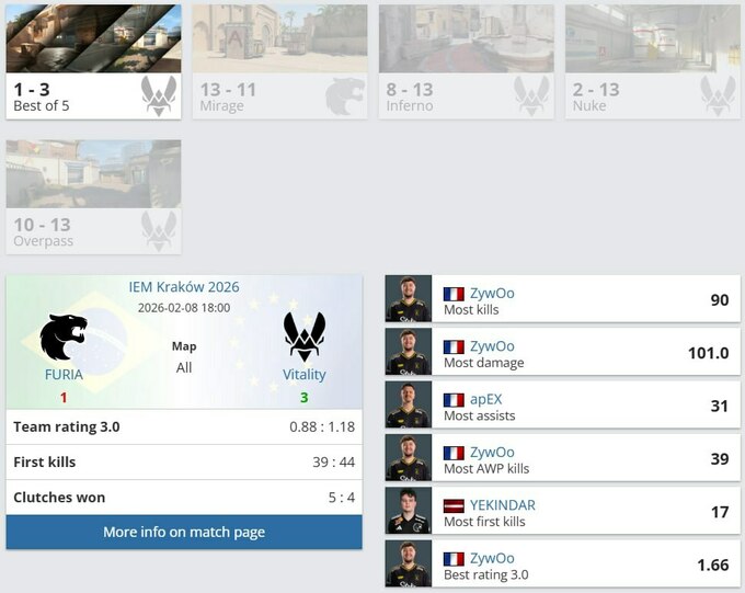 Vitality здобули титул IEM Krakow 2026 з CS2, перемігши FURIA у гранд-фіналі формату Bo5 з рахунком 3:1. Після поразки на Mirage (11:13) французький колектив впевнено закрив серію, вигравши Inferno (13:8), Nuke (13:3) та Overpass (13:10).