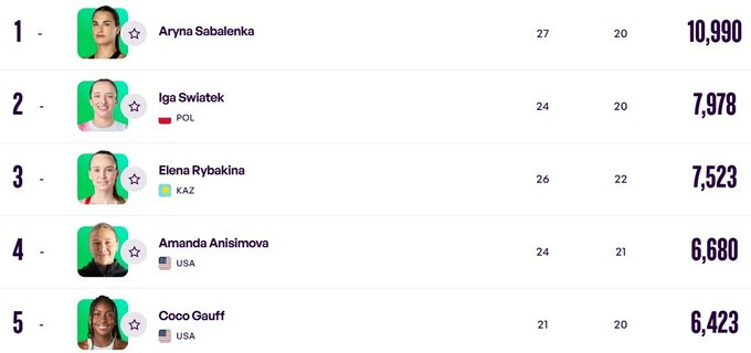 - (1) Аріна Соболенко – 10 990 очок