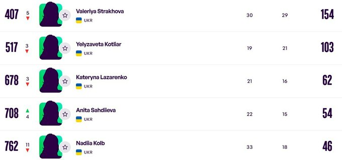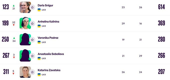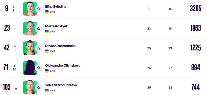Еліна Світоліна продовжує залишатися першою ракеткою країни, піднявшись із десятого місця на дев'яте. Марта Костюк розмістилася на 23-му рядку, а Даяна Ястремська тепер посідає 42-ю позицію (+1).