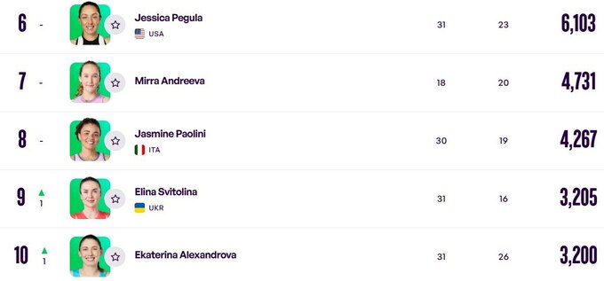 Еліна не виступала минулого тижня, але випередила швейцарку Белінду Бенчич, яка не зуміла захистити 500 очок минулого року за перемогу в Абу-Дабі і залишила першу десятку.