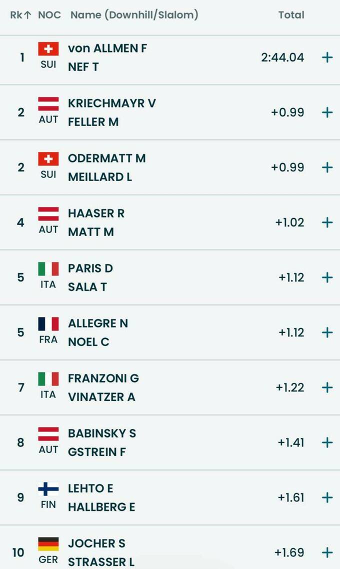 Ситуація з іншими місцями на подіумі виявилася кумедною: ще одна швейцарська пара та дует австрійців завершили командну комбінацію з однаковим результатом.