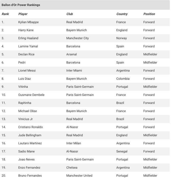 Далі йдуть Ламінь Ямаль, Деклан Райс, Педрі, Ліонель Мессі, Луїс Діас, Вітінья та Усман Дембеле.