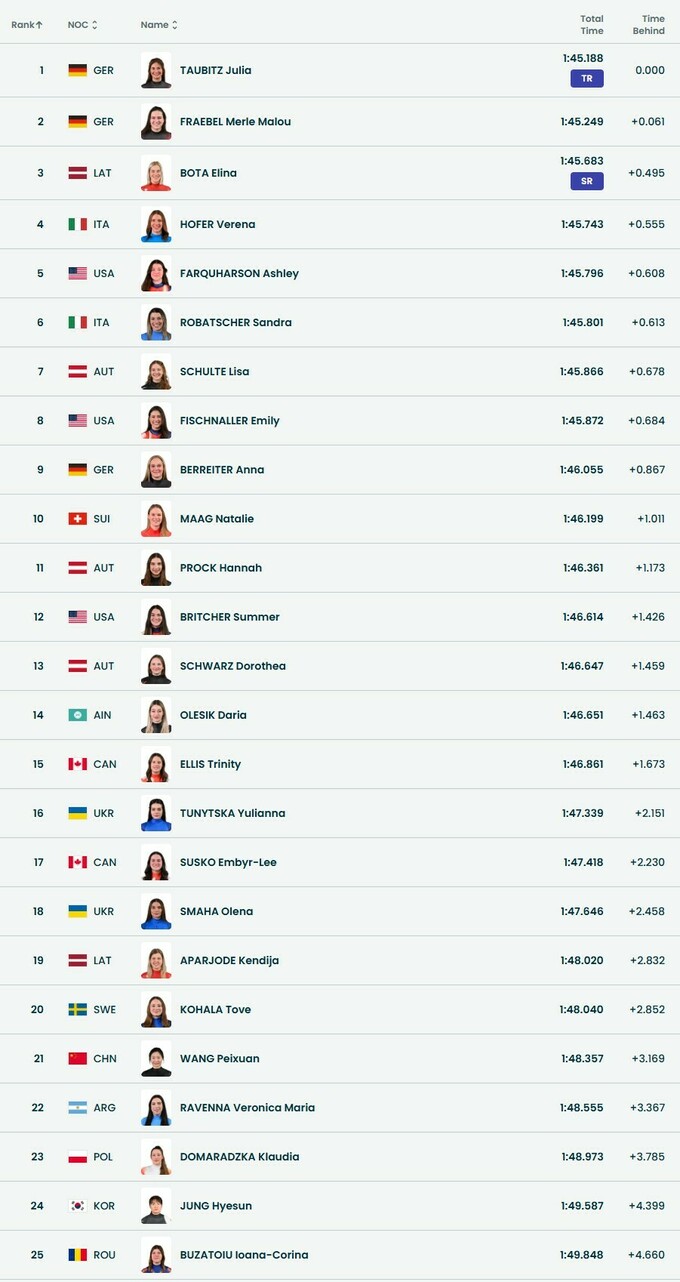 Найшвидший час показала представниця Німеччини Юлія Таубіц, яка з новим рекордом траси подолала дистанцію за 1:45.188. Друге місце посіла німкеня Мерле Малу Фребель (1:45.249), третє – латвійка Еліна Бота (1:45.683).