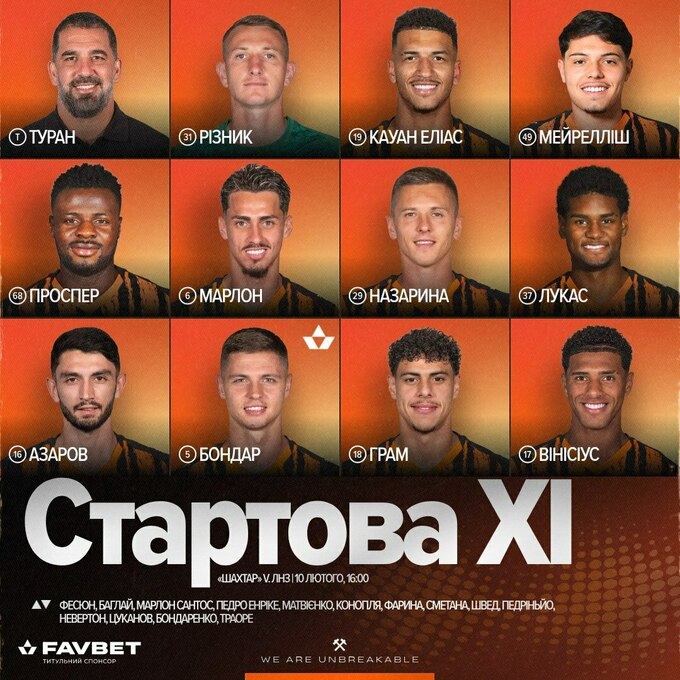 Шахтар: Дмитро Різник, Кауан Еліас, Лука Мейрелліш, Проспер Оба, Марлон Сантос, Єгор Назарина, Лукас Феррейра, Іраклі Азаров, Валерій Бондар, Алаа Грам, Вінісіус Тобіас