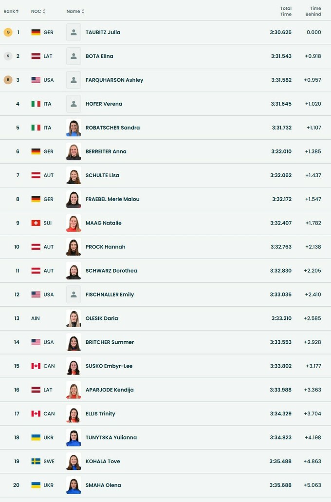 Санний спорт. Визначено чемпіонку ОІ, Туницька та Смага – у другому десятку