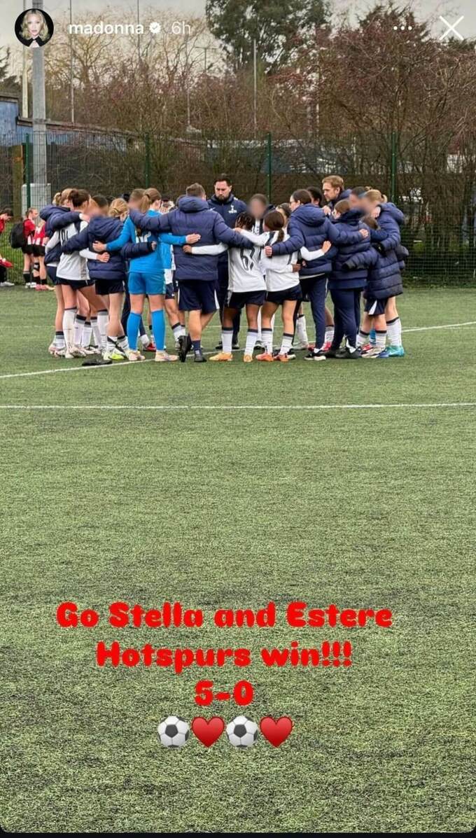 Напередодні Мадонну помітили біля кромки поля на матчі дівочої команди «шпор» U-14, за яку виступають її прийомні близнючки Стелла та Естер. Співачка з’явилася в ефектних сонцезахисних окулярах, остаточно закріпивши за собою образ «футбольної мами».