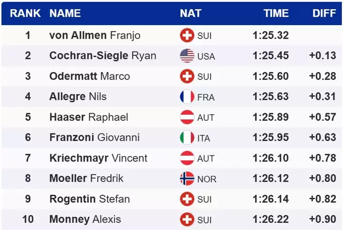 Другим фінішував американець Раян Кокран-Зігле з відставання в 0.13 секунди.